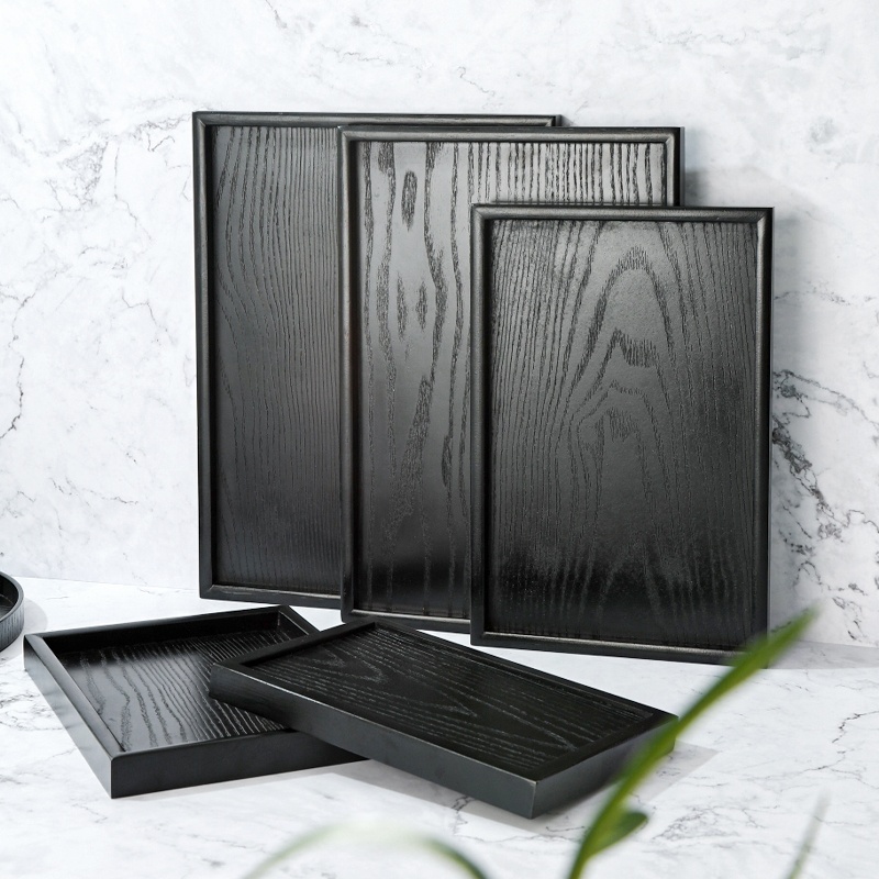 Özel Logo dikdörtgen meşe ahşap tepsi dayanıklı servis tabağı çay meyve partisi ekmek Dim Sum akşam yemeği için el-cilalı tekniği